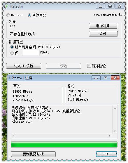 2、在这之前先测试一下U盘容量是不是足量的,使用的工具是h2testw,它能轻松识别U盘是不是扩容的。