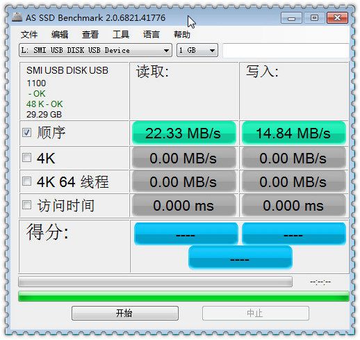 3、下面开始测试U盘读写速度,用的工具是AS SSD Benchmark,相对来说测出的速度比较准,结果如下: