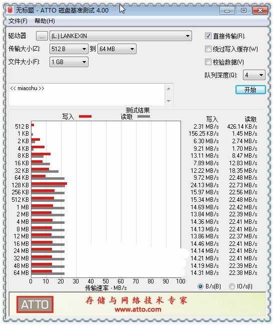 可以看到只测了最大的读写速度,读取22.33M/S,写入14.84M/S,这在usb2.0下是算是达标了,表现不差。
