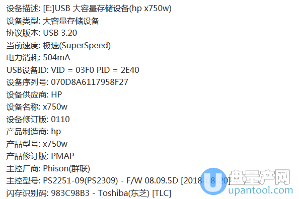 可以看到主控是群联的ps2251-09,一般此主控都用在正片U盘里,算不错的主控,闪存是TLC东芝的,也算还行,毕竟现在都是tlc的天下了。