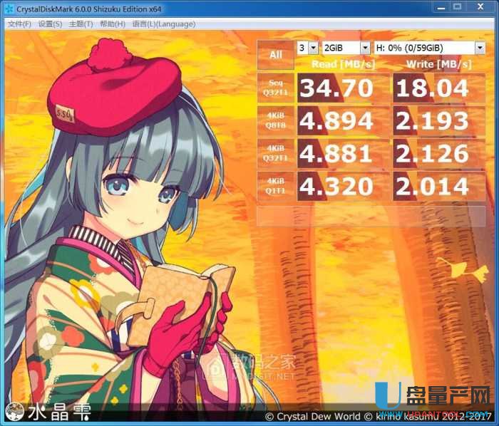可以看到U盘的读取速度是34M/S,写入18M/S,而小文件读取速度只有4M/S,写入只有2M/S。