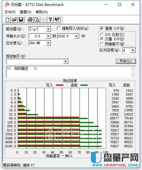 2、然后用ATTO Disk Benchmark来测试一下U盘的各大小文件的读写速度如下图。