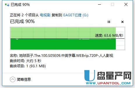 4、工具测试的速度可能有偏差,所以我们下面用实际拷贝数据到U盘里的测试实际的读写速度。