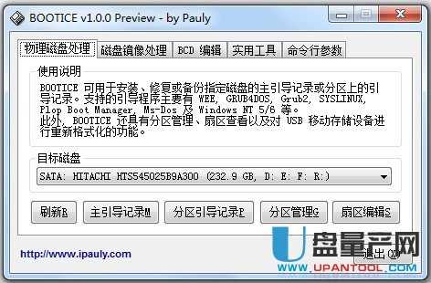 BOOTICE v1.2.0用于安装及维护磁盘上的主引导记录,以及分区引导记录数据,另外还提供磁盘扇区编辑及备份恢复功能,支持管理磁盘分区,可以激活或者隐藏指定分区,更改分区标识。可以低格式化指定分区、对指定分区进行分区。备份/恢复分区表、更改主引导记录类型。