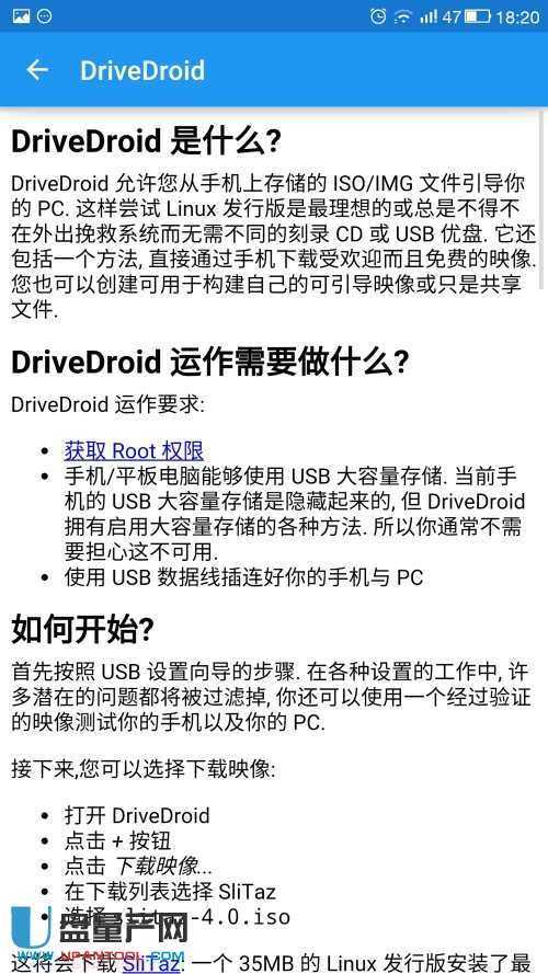 目前最新版的DriveDroid汉化去广告且去限制版本V0.10.3,如果你还不知道DriveDroid是什么,那就out了,它是一款可以把你手机变电脑启动盘的安卓手机软件,只需要把你下好的iso或者img格式的启动镜像做到手机里就可以通过手机启动电脑来维护或者重装系统了,这样在外出没有携带启动U盘的情况下不需要刻录光盘都可以给任何电脑启动挽救PC系统。而且软件自带linux启动镜像下载端口,你可以下载它给你准备的免费iso镜像,但这软件是国外的,所以可能这些镜像水土不服,建议下载量产网winpe栏目里的iso镜像这样更高的成功率启动你的电脑。