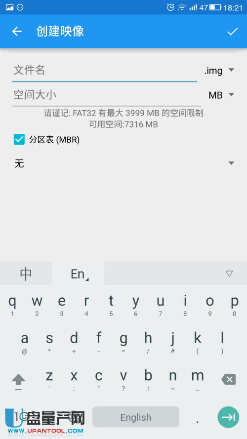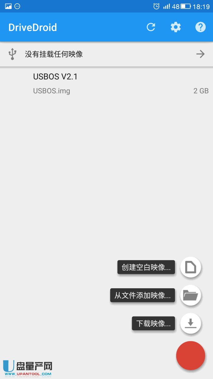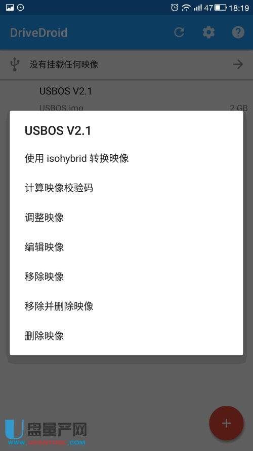 上图显示已经下载好的2G的一个映像,随时可以挂载,下面3个选项分别是创建空白映像,从文件添加映像,下载映像。其中空白映像创建是为了你自己下载的iso镜像准备的,需要用到ultraiso把iso写入手机创建的空白映像里。