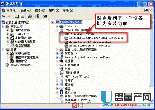 8、重启后再到设备管理器中查看,在IDE ATA/ATAPI控制器项下你会看到“Intel(R) ICH9M-E/M SATA AHCI Controller”,当然,由于平台不同,前半部也可能显示为ICH7M-E/M或ICH8M-E/M,或是更高的版本,但是后面红色大号字的部分一定要出现,否则即不说明AHCI驱动正确安装。至此,操作完毕。