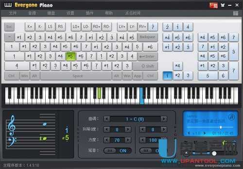 EveryonePiano是一款钢琴模拟软件,它通过键盘来演奏美妙的钢琴曲,让你0成本学习弹钢琴。本软件为免费版,无需注册即可使用,内置一些比较 经典的曲目,可以直接打开播放。软件自带有强大的单色库,单色效果非常逼真,可以完全模拟真实的钢琴,即使你的声卡是集成的,也可以实现无延迟的演奏效 果,内置多种插件,可以即时下载并安装。另外,如果你是一个钢琴新手,可以通过丰富的视频教程来快速上手。可以通过字母区及数字区的键位来模拟钢琴的键 位,在实际使用中还可以调节面板中的各种参数,如曲调、力度及延音等。