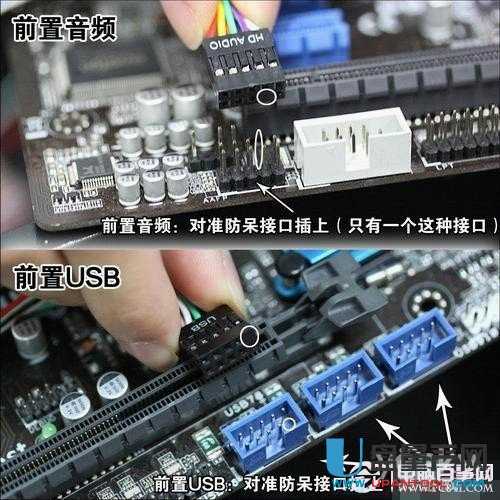 最有难度的一个环节,连老鸟也觉得头痛,我们分开两个部分来说。首先是前置USB接口与前置音频接口,以往的机箱两这部分接口没有做到一体化设 计(所有线都是散开的,接错一条怎么办?呵呵,等着看好戏吧),非常不人性化,安装难度也大。不过近几年大部分机箱已采用一体化设计,已经对准防呆位置, 就可以轻松接上。