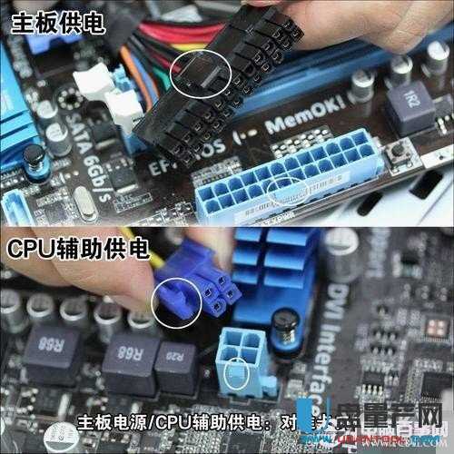 接在主板上得电源,一般有两种线,24PIN总电源与8PIN/4PIN的CPU辅助供电,对准卡位插上即可。稍有难度的是CPU辅助供电部分,会有两种特殊情况。