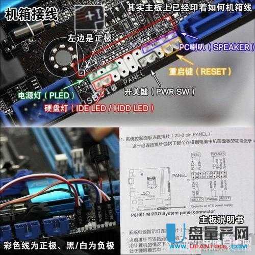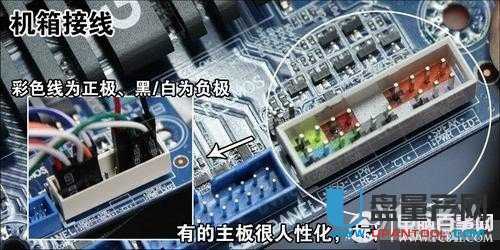 然后就是硬盘灯、电源灯、开关、重启和PC喇叭这五个老大难问题了,最简单的方法是查找主板说明书,找到相应的位置,对着接线,记住一个最重要的规律,彩色是正极、黑/白是负极。