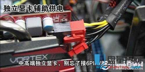 中高端显卡,别忘了要接上6PIN或8PIN的辅助供电哦。一些高端独立显卡,还要接多个辅助供电,要全部接上。电源线不够怎么办?用显卡附送的转接线吧。