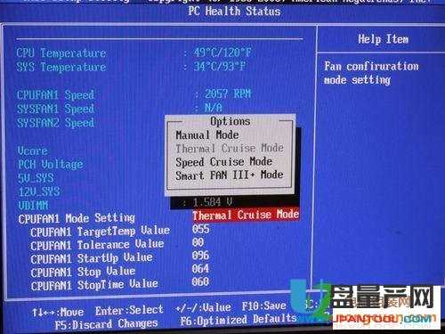 2、 Thermal Cruise Mode下的选项比较多,分别是CPUFAN1 TargetTemp Value(风扇目标温度值)、CPUFAN1 Torlerance Value(风扇上下限值)、CPUFAN1 StartUp Value(风扇启动温度)、CPUFAN1 Stop Value(风扇停止或者低速转动温度)、CPUFAN1 StopTime Value(风扇低速运行时间)