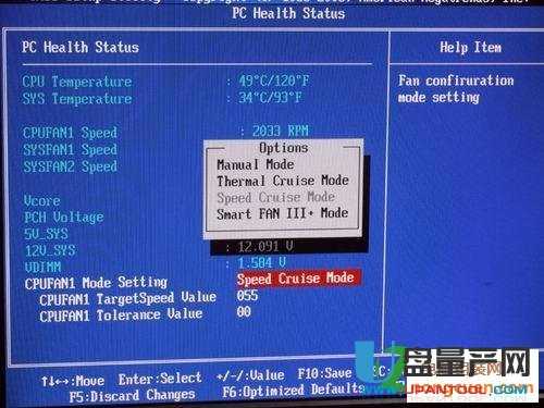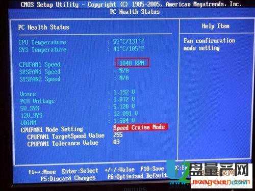 6、 具体有什么效果,一试便知。我们用比较直观快捷的Speed Cruise Mode(按转速调节)来测试,默认情况下CPUFAN1 TARGETSPEED VALUE是55,CPUFAN1 TOLERANCE VALUE是03,这时风扇转速为20