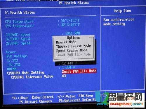 1、在主板和CPU风扇都具备自动调速的情况下,接下来我们要进入主板Coms中进行一定的设置,在PC Health Status单元里面有一个CPUFAN1 Mode Setting选项,这个选项就是控制CPU风扇的,分别有三个模式Thermal Cruise Mode(按温度调节)、Speed Cruise Mode(按转速调节)、Smart FAN III+ Mode(智能模式)。