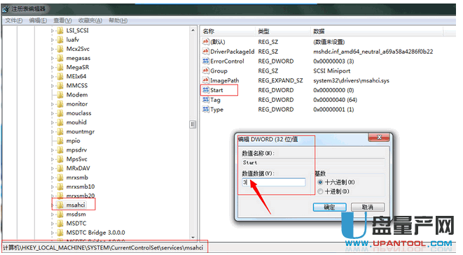 打开注册表编辑器之后,依次找到 “HKEY_LOCAL_MACHINE---System---CurrentControlSet---Services---Msahci”,然后找到并打开 “Start”的项目,将弹出的默认的参数由 3 改为 0 。然后点击确定,重启电脑。
