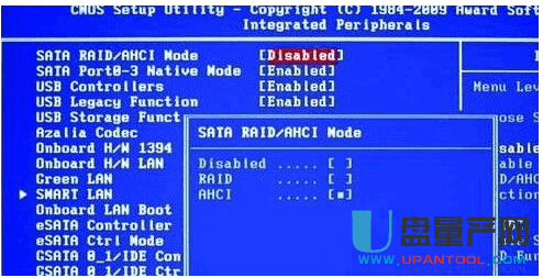 重新启动,修改BIOS下SATA工作模式为AHCI选项,以下修改硬盘模式方法为“AHCI”,有些则为Enabled或Disabled(不同机型BIOS中硬盘模式修改位置及方法略有差别)