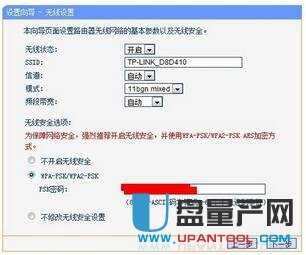 下一步后进入到的是无线设置,我们可以看到信道、模式、安全选项、SSID等等,一般SSID就是一个名字,你可以随便填,然后模式大多用11bgn.无线安全选项我们要选择wpa-psk/wpa2-psk,这样安全,免得轻意让人家破解而蹭网。