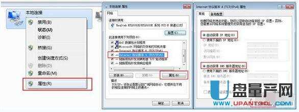 依次点击"打开网络和共享中心--更改适配器设置/管理网络连接--右击本地连接--属性"(或者点击"开始按钮--控制面板--网络和Internet--网络和共享中心--更改适配器设置/管理网络连接--右击本地连接--属性") ,然后按照下图配置即可。