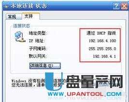 经过上面的配置后,您的电脑就会自动向路由器"索要"IP地址,路由器也会在接收到请求后分配参数给电脑,成功后点击电脑右下角的小电脑图标,在本地连接状态的"支持"选项卡里可以看到电脑获取的参数