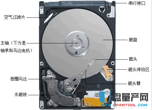 传统普通硬盘也就是机械硬盘,主要由:盘片,磁头,盘片转轴及控制电机,磁头控制器,数据转换器,接口,缓存等几个部分组成,如下图。