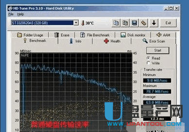 通过以上传输速率测试图可以看出,固态硬盘表现出色,波浪形的曲线,最小传输率也有91.2MB/S,平均传输率则达到135.7MB/S,虽然离标称的170MB/S最大速率有一定差距,但相比机械硬盘只有63MB/S的速率,固态硬盘的成绩已是相当可观。值得一提的是,在介绍固态硬盘时我们已介绍到,固态硬盘采用随机存取,没有磁头结构,寻道时间为非常接近零,这是机械硬盘永远无法达到的。