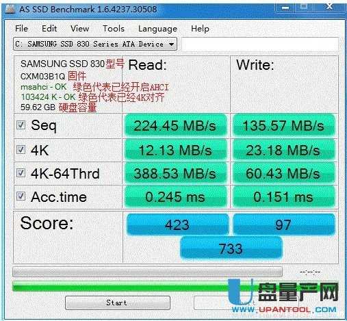 在安装使用上,固态硬盘建议使用win7版本以上的系统,并且必须开启AHCI,4K要对齐。可以下载AS SSD Benchmark(固态硬盘测试软件) 来测试一下,能显示AHCI是否开启,4K是否对齐。