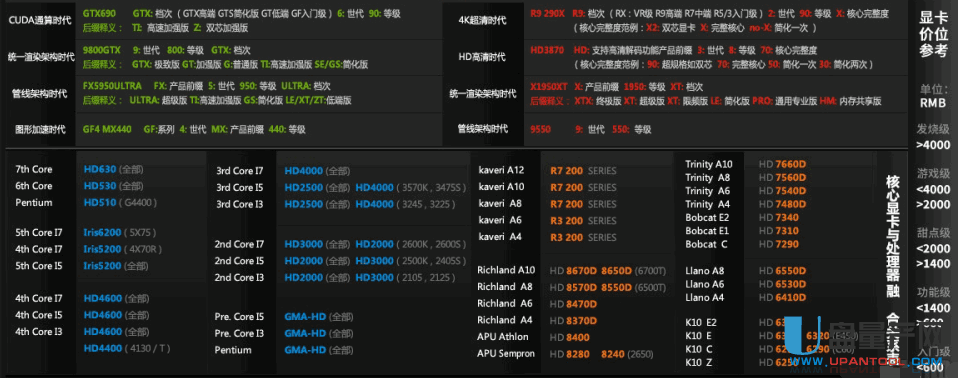 电脑显卡是来控制电脑图像输出的,它是主机与显示器之间连接的“桥梁”,作用是控制电脑的图形输出,负责将CPU送来的的影象数据处理成显示器认识的格式,再送到显示器形成图象。由此可见显卡是非常重要的,直接决定了我们电脑使用的舒适度。那么现在市面上的显卡怎么用呢?我们通过一张显卡天梯图就可以一目了然,并且他把笔记本显卡和台式的分开对比。