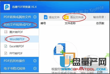 下载并安装“迅捷PDF转换器”,并打开。在打开的“迅捷PDF转换器”界面中,选择左侧“其它文件转换成PDF”下面的“Word转PDF”,并单击上方的“添加文件夹”按钮: