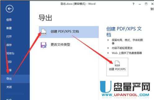 在打开的文件选项窗口界面中,依次点击“导出”-->“创建PDF/XPS文档”-->“创建PDF/XPS”选项命令。