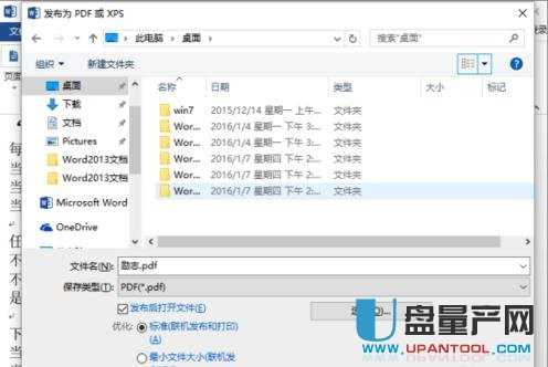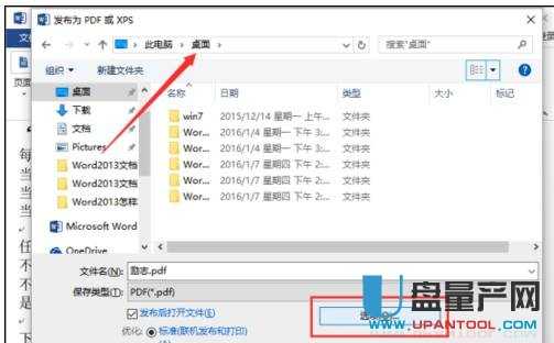 在“发布为 PDF或XPS”对话窗口中,保存文件到我们需要存放的目录。可以点击“选项”按钮进行设置,这里演示保存在“桌面”。然后再点击“发布”按钮。