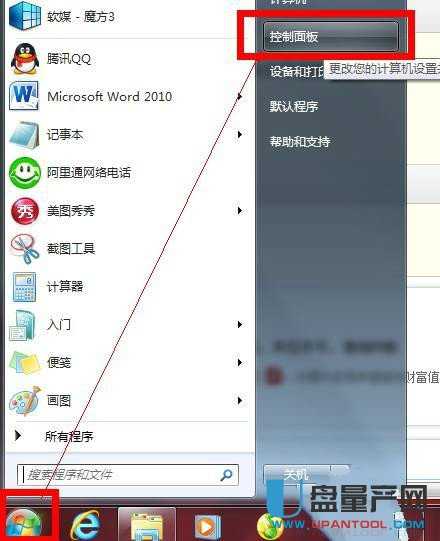 点击开始菜单,然后点击控制面板按钮。打开控制面板。