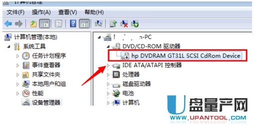 然后找到左边的“设备管理器”如下图,在右边的窗口里找到DVD或者CD ram等设备字样
