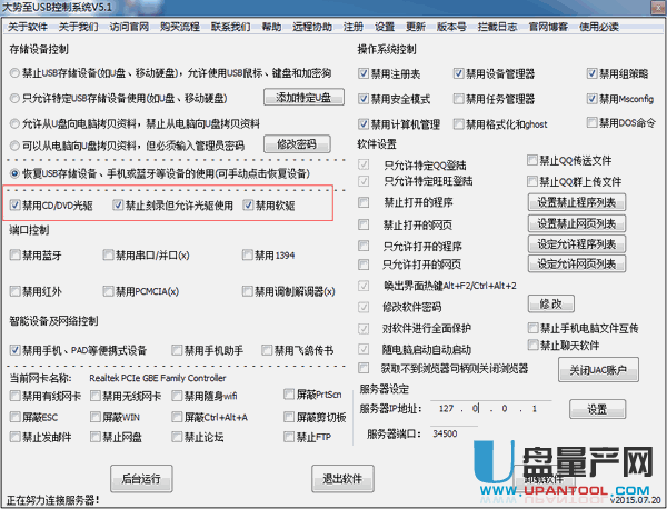 下载并运行大势至USB控制系统软件,然后我们就可以在“存储设备控制”栏目中勾选“禁用刻录但允许光驱使用”,或者勾选禁用cd/DVD光驱,按你的需要选择一个就行了,非常的简单快捷。