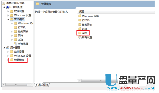 2、然后在弹出的窗口里点击左边的 用户配置,然后点击管理模板,然后点击右边的系统,如下图。