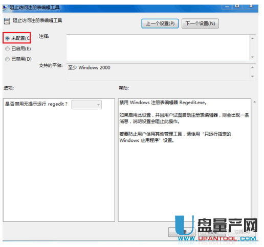 4、然后可以看到把“已启用”更换为“未配置”或“已禁用”就可以了,再按上面的两种方式打开注册表编辑器就没问题了。