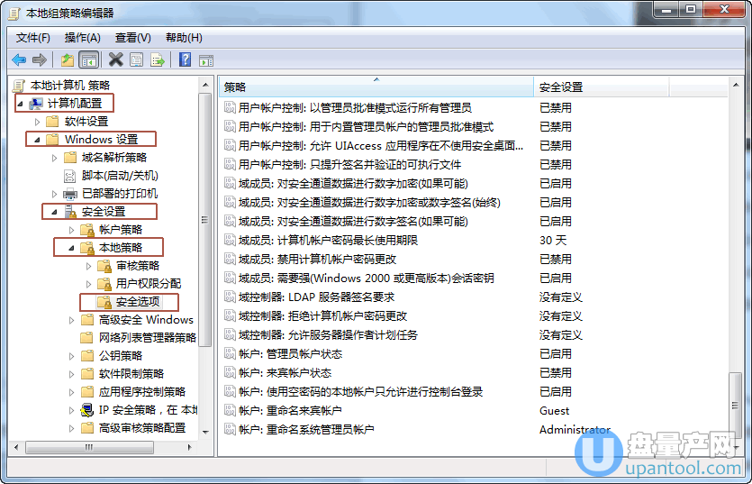 2、我们依次打开 “计算机配置”>“Windows设置”>“安全设置”>“本地策略”>“安全选项”,如下图红框里所示,展开最后一项后,我们点右边的窗口滑块下拉到最下方,找到:重命名系统管理员帐户选项,下图的最后一个就是了,并双就可以打开它。