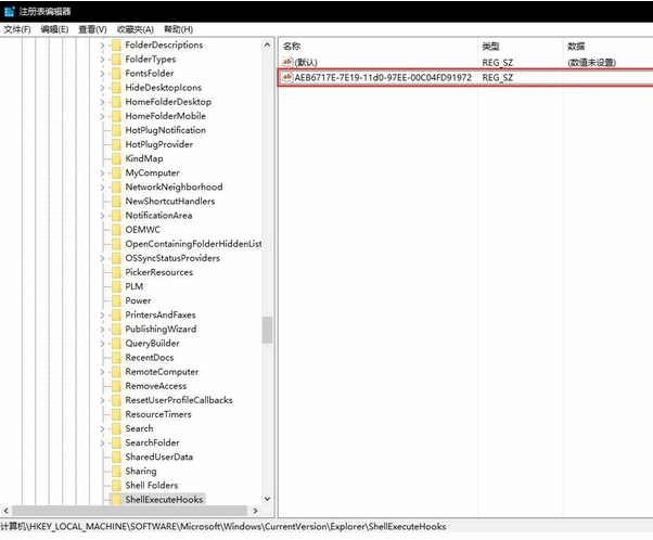然后在ShellExecuteHooks里删除键值只剩默认或为{AEB6717E-7E19-11d0-97EE-00C04FD91972}这个,其他键值都删除;