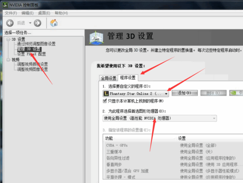2、然后在控制面板里点击管理3D设置,如下图,在右边窗口的程序设置里选择自定义程序里选择我们的游戏程序,然后在首选图形处理器里选择高性能NVIDIA处理器。