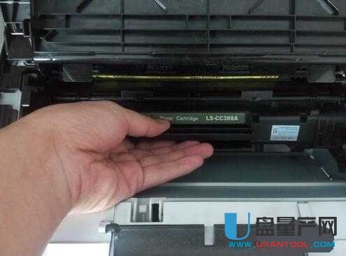 2、然后就是取出硒鼓了,按下硒鼓舱门栓锁,打开硒鼓舱门,抓住硒鼓上的把手往上拉,稍用点力就可以把硒鼓拿出来。