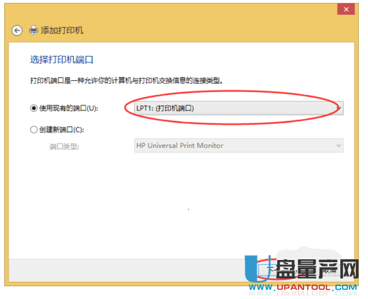 9、然后选中使用现有的端口,选择LPT1打印机端口