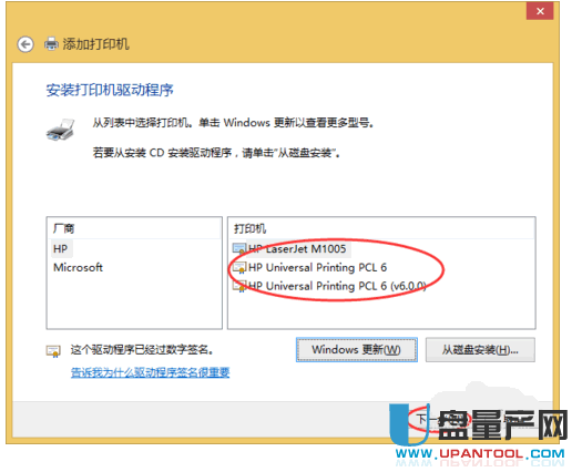 10、点下一步后,就出现hp的驱动选择了,当然在厂商位置选HP,然后在打印机位置选择M1005驱动。