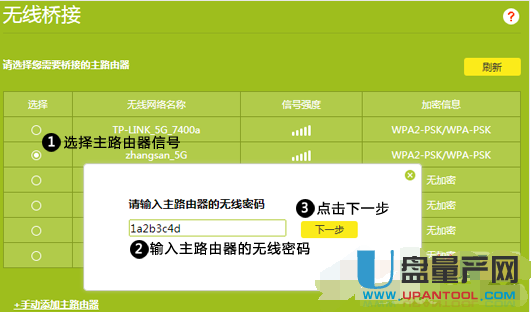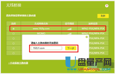 在无线信号扫描结果中,找到、选择需要被桥接的无线信号——>输入该信号的“无线密码”