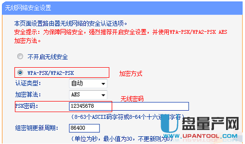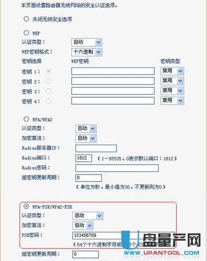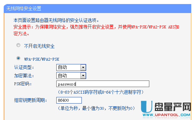 其中SSID号和信道号任意设置,其它设置如上图。记下所设置的SSID和信道号备用。然后设置无线连接密码,在无线设置 - 无线安全设置下面按下图设置密码,并记录备用。