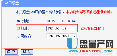 首先在网络参数 - LAN口设置下设置路由器ip地址为 192.168.1.2 子网掩码不变,重启无线路由。