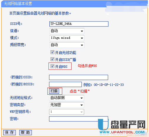 登录路由器后依次点击“无线设置”、“基本设置”、“开启WDS”打钩,点击“扫描”