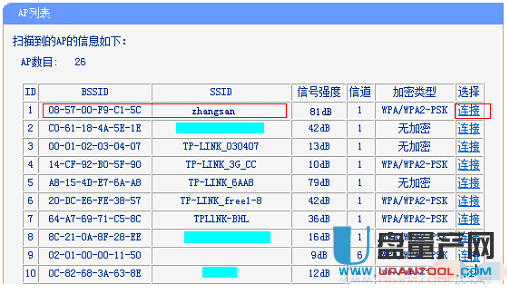 找到主路由器A的“SSID”——>点击“连接”。