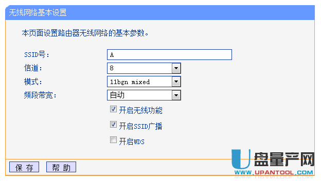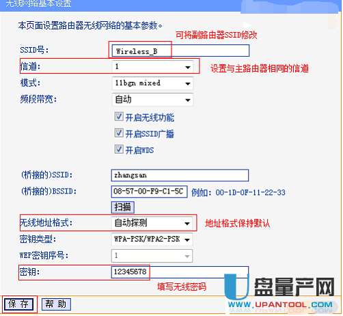 1、TP--Link路由作为主路由A,通过WAN口连接网线并设置网络参数。无线设置 - 基本设置参数