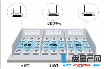 A、B、C三个部门如果只使用1个无线路由器,可能会出现一些计算机搜到信号很弱或者搜索不到信号,导致无法连接无线网络。解决方法是:A、B、C三个部门各自连接一台无线路由器,三个无线路由器通过WDS连接就可以实现整个区域的完美覆盖、消除盲点。