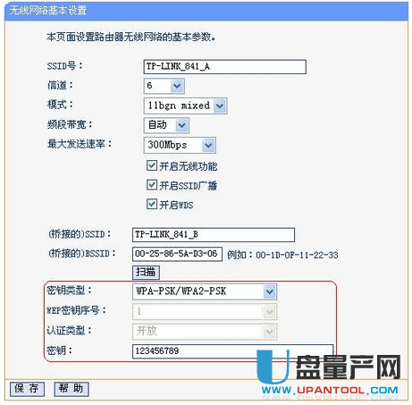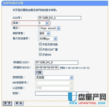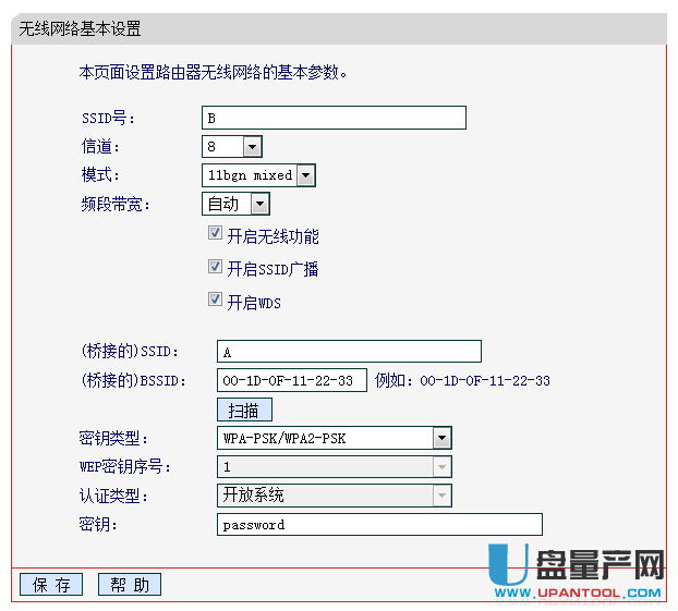 设置“信道”为1(与主路由器A的信道保持一致)——>“密钥类型”选择:WPA-PSK/WPA2-PSK——>在“密码”填写主路由器A上的无线连接密码——>点击“保存”。